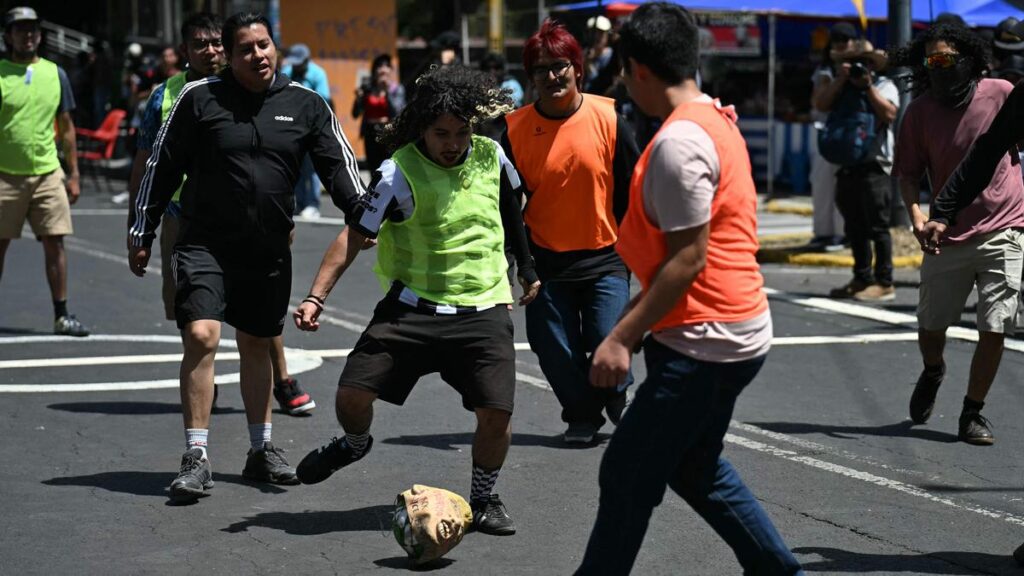 The event unfolded on the white-painted asphalt of a busy ring road, with demonstrators wearing jerseys, while an organiser provided match commentary over a loudspeaker. More details continue to emerge and will be reported as confirmed.
